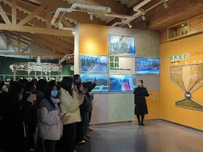 讲解员为师生们详细讲解酸奶的品种和君乐宝乳业酸奶现代化生产加工的过程,在奶牛科普馆中陈设的奶牛模型和养牛人蜡像中感受着君乐宝乳业的企业文化;在挤奶大厅中观看生产线上工业化挤奶、机器化冲洗消毒和奶源质量的检查工作;在游客中心的休息场所体验牧场文化花海等景观……