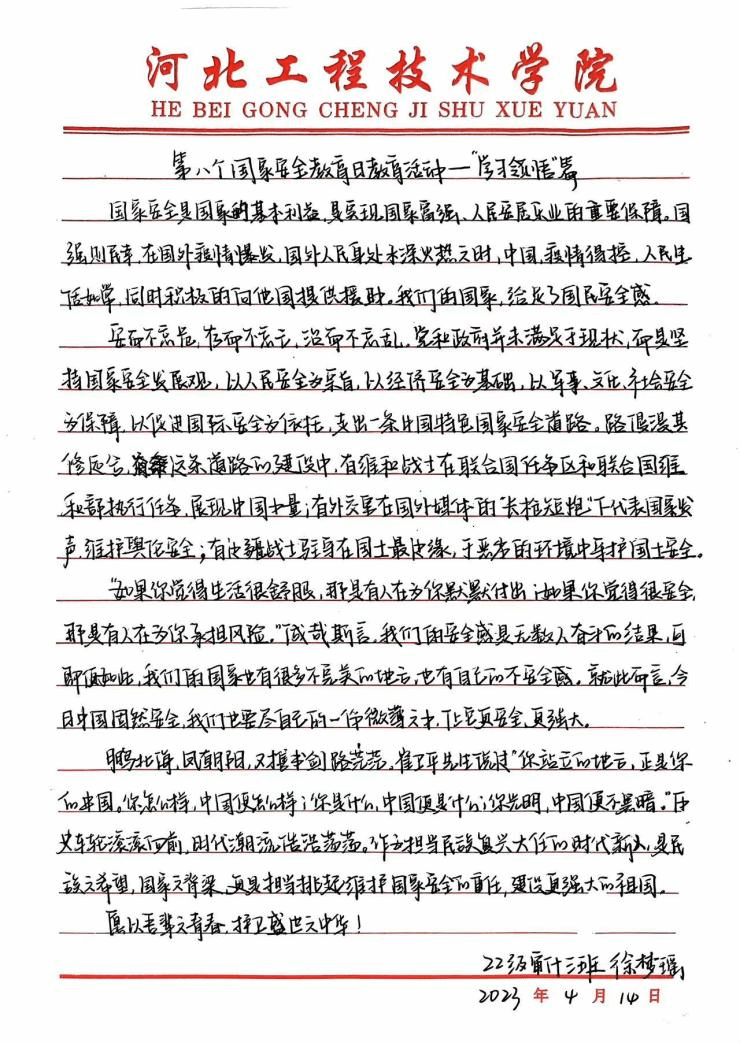 老师们课上讲解完毕后,同学们课下也结合自身对于总体国家安全观的体会积极书写学习感悟回顾学习过程。新时代国家安全发生了历史性的变革,在这个过程中我们也取得了一些历史性成就、积累了许多宝贵经验;国安才能国治,治国必先治安。没有国家安全作为前提条件,国家就难以展开正常的建设和发展。国家安全保障人民的安全,人民的安全有赖于国家安全;接下来,我们需要进一步增强安全意识,并且落实到自身,落实到生活中,共同来维护国家安全。