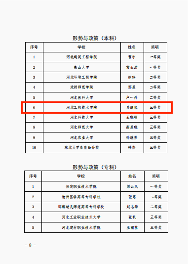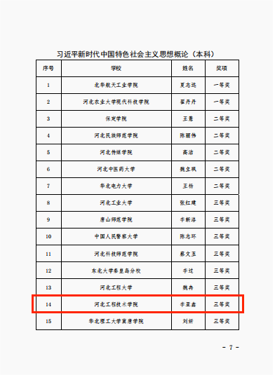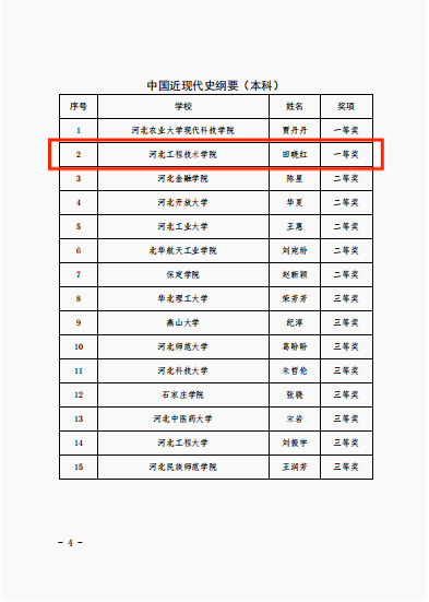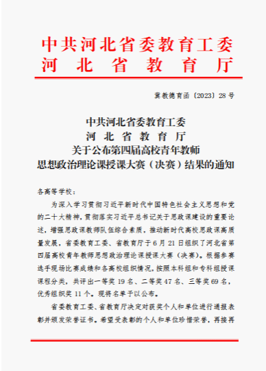 近期,由河北省委教育工委、省教育厅组织的河北省第四届高校青年教师思想政治理论课授课大赛(决赛)结果公布。 我校马克思主义学院教师田晓红、路晓佳、吴丽佳、李亚鑫表现优异,分获“中国近现代史纲要”(本科)一等奖、“毛泽东思想和中国特色社会主义理论体系概论”(本科)三等奖、“形势与政策”(本科)三等奖、“习近平新时代中国特色社会主义思想概论”(本科)三等奖,学校荣获大赛优秀组织奖。