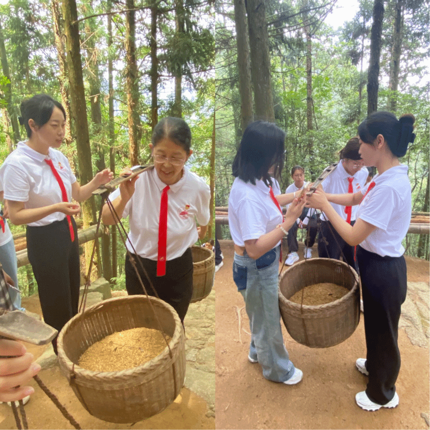 在朱毛红军挑粮小道,学员们挑着扁担沿着那条崎岖陡峭的羊肠小道艰难而下,亲身感受当年红军战士挑粮的艰辛历程,走进艰苦卓绝的峥嵘岁月。