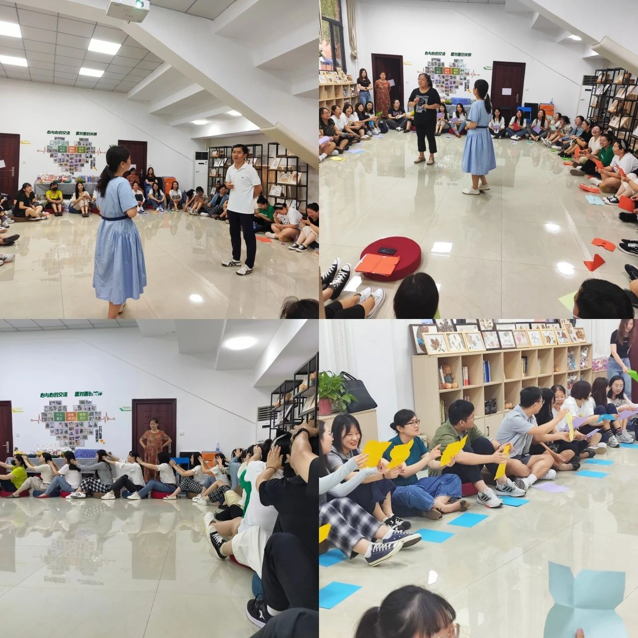 随后,心理健康教育教研组组长李佳丽老师带领大家开展了丰富多彩的团体心理活动:“热身按摩操”“撕纸游戏”“多人多足”等一系列游戏。“热身按摩操”通过肢体接触,放松了身体,活跃了氛围,拉近了老师们的距离;在“撕纸游戏”环节,大家领悟到了沟通的重要性。“多人多足”游戏,各组教师踊跃参加,个个卯足了劲,现场气氛紧张又活跃,妙趣横生,欢乐无限。