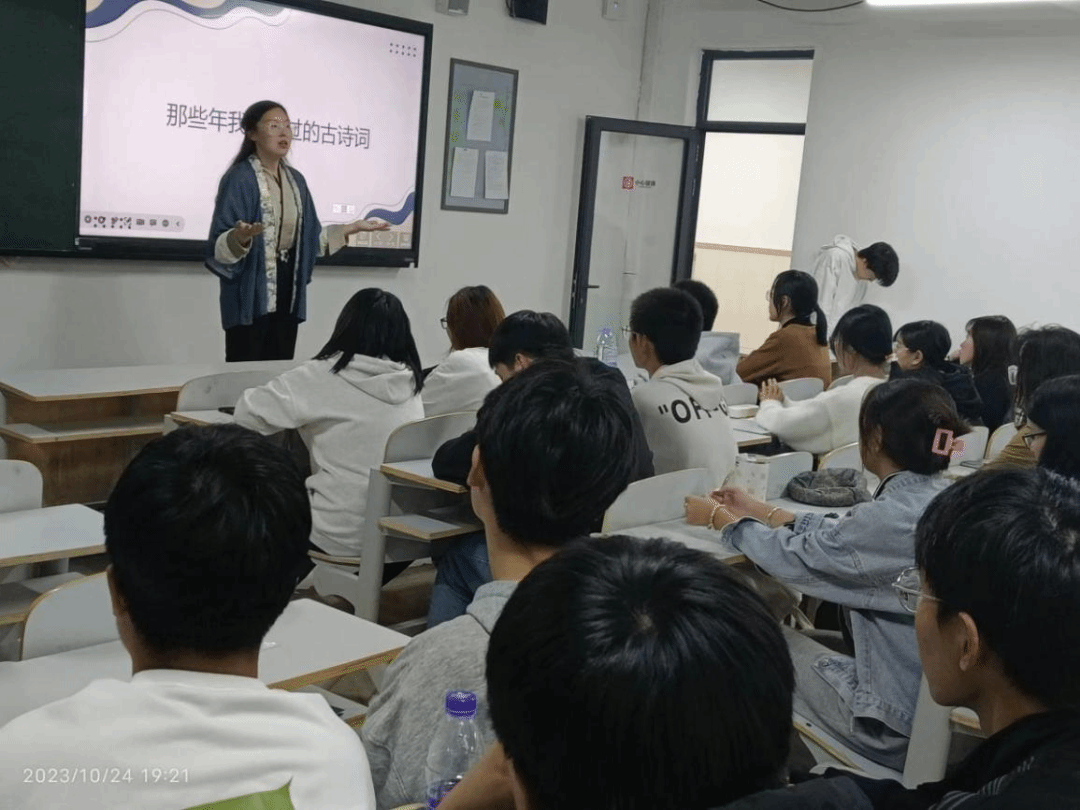 教研室主任范凯轩老师以当前大学生学习传统文化意识淡薄入手,从诗词中引发古今情感共鸣、丰富个人人生阅历、传承汉语悠久历史、厚植青年爱国情感等方面强调了诗词在培养胸怀人民、胸怀国家、胸怀天下,担当民族复兴大任时代新人过程中的重要作用。