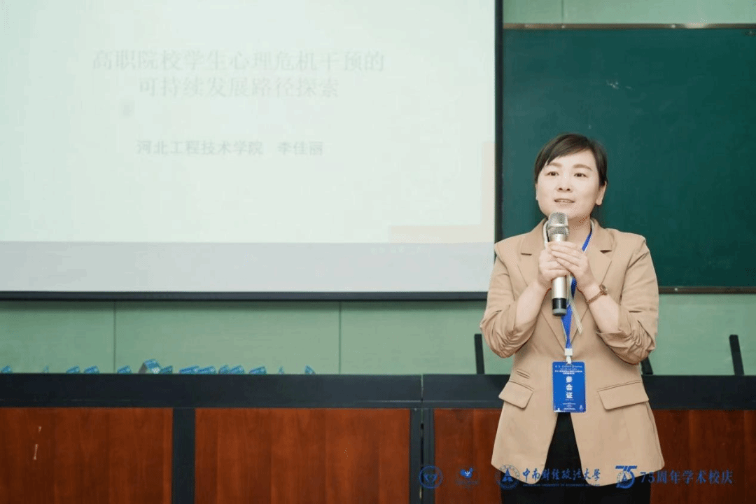 其中,我校大学生心理健康教育中心主任李佳丽老师代表学校做经验交流,讲解了《高职院校学生心理危机干预的可持续发展路径探索》,李佳丽主任从常见心理危机、常规处理方式、存在哪些弊端、解决方法探索四个方面做出精彩的演讲,她指出,大学生常见的心理危机分为四种类型,分别是发展事业型、生活事件型、职业事件型、生命事件型,并运用生动典型的案例讲解心理危机出现时如何干预以及常规的处理方式是否有效,她建议,为了避免常规处理方式的弊端,我们可以从医校合作、校企合作、大中小学和社会一体化管理等方面进行心理危机干预,赢得了参会人员的一致好评。