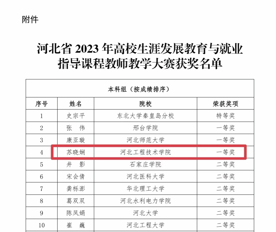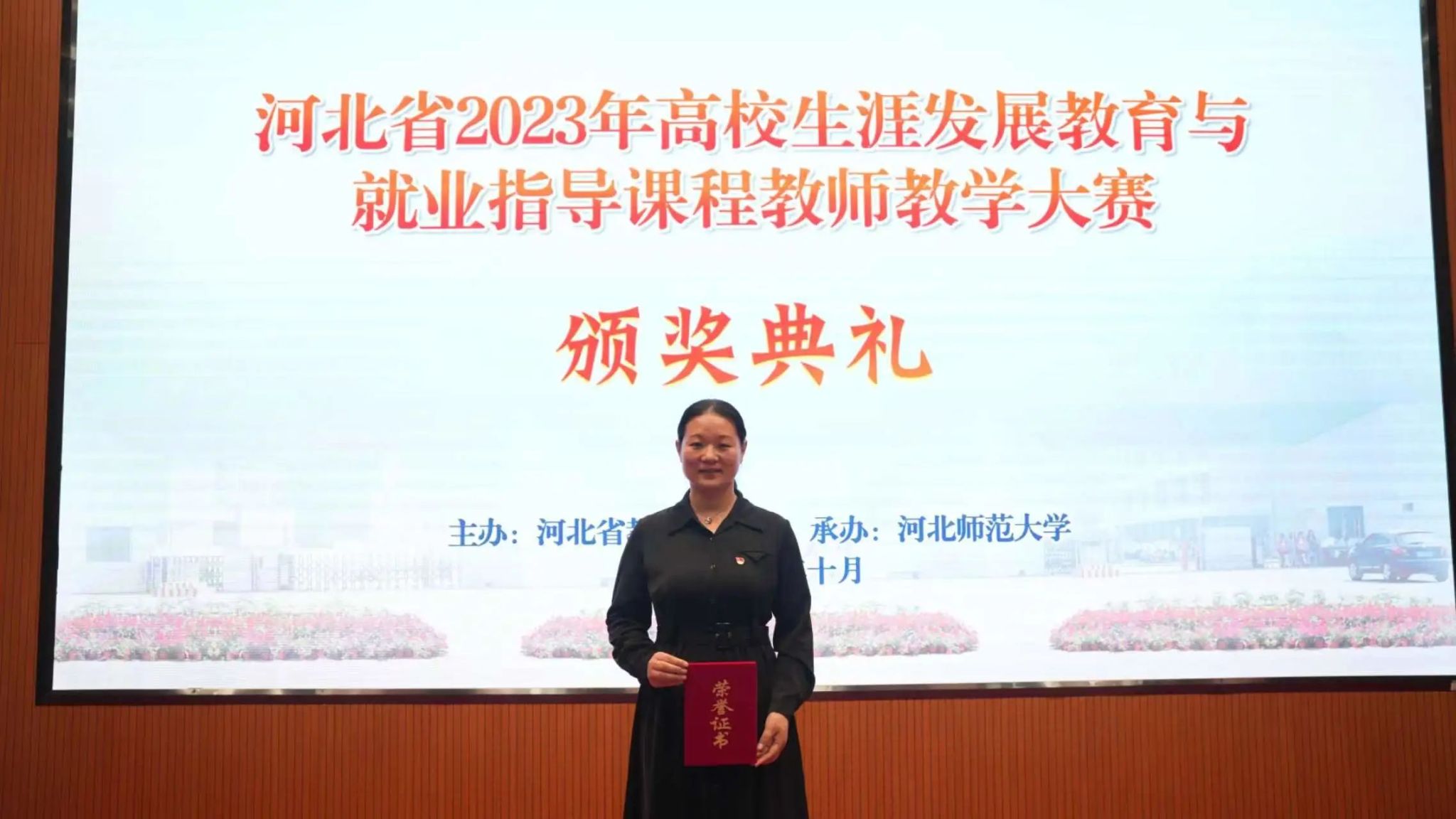 10月28日至29日,河北省2023年高校生涯发展教育与就业指导课程教师教学大赛总决赛在河北师范大学成功举办。经过激烈角逐,马克思主义学院专任教师苏晓娴凭借扎实的基本功晋级省线下总决赛,取得优异成绩,荣获本科组一等奖。