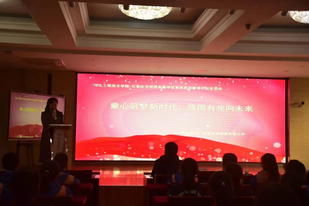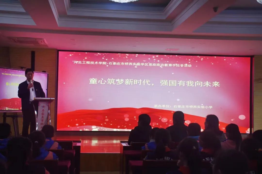 为深入学习贯彻习近平新时代中国特色社会主义思想,统筹推进大中小学思政课一体化建设,切实发挥思政课立德树人关键课程作用,全面增强思政育人效果,11月8日下午,马克思主义学院联合石家庄市桥西实验学区开展“童心筑梦新时代,强国有我向未来”手拉手活动。参加本次活动的有校党委书记、马克思主义学院院长常新平,马克思主义学院党支部书记、副院长李洁,副院长苗正超,桥西实验学区桥西实验小学党支部书记、校长王尧,副校长王生军,桥西实验学区五里庄小学党支部书记、校长杨玉辰,桥西实验学区宫尹小学党支部书记、校长宫金庆,以及我校土木工程学院思政教研室主任刘放,软件学院思政教研室主任范凯轩。本次宣讲由范凯轩老师主讲。