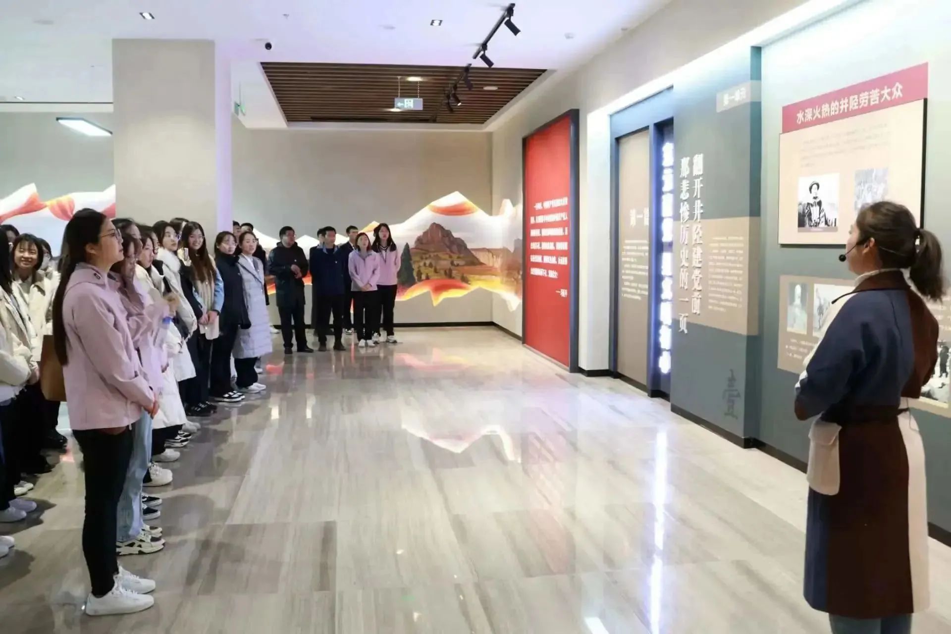 抵达井陉县爱国主义教育基地后,马克思主义学院专任教师沈子茹从井陉悠久历史、地理风貌、革命故事、民风民俗四个方面对井陉县进行了详细介绍。随后,研学师生在讲解员的带领下,参观百团大战主题馆、绵右渠主题馆、抗洪主题馆、太行天路主题馆等,大家被展览陈列的内容所深深吸引。通过历史文物、图文展陈、主题浮雕、人物雕塑和多媒体展示,研学师生更加全面地了解到井陉县人民的英勇抗战历程,通过革命者的珍贵照片和实物,再现井陉人民在中国共产党的领导下争取民族独立的奋斗历程和辉煌成就。研学师生与井陉县爱国主义教育馆的工作人员进行深入交流,双方就如何“追寻红色记忆,厚植家国情怀”分享了各自的经验和见解,探讨了如何更好地传承和弘扬爱国主义精神。同学们积极发表自己的观点和建议,并表达了对井陉县爱国主义教育事业的赞赏。师生在一个个红色故事和历史场域中,感受英雄人物榜样力量,汲取红色文化精神。