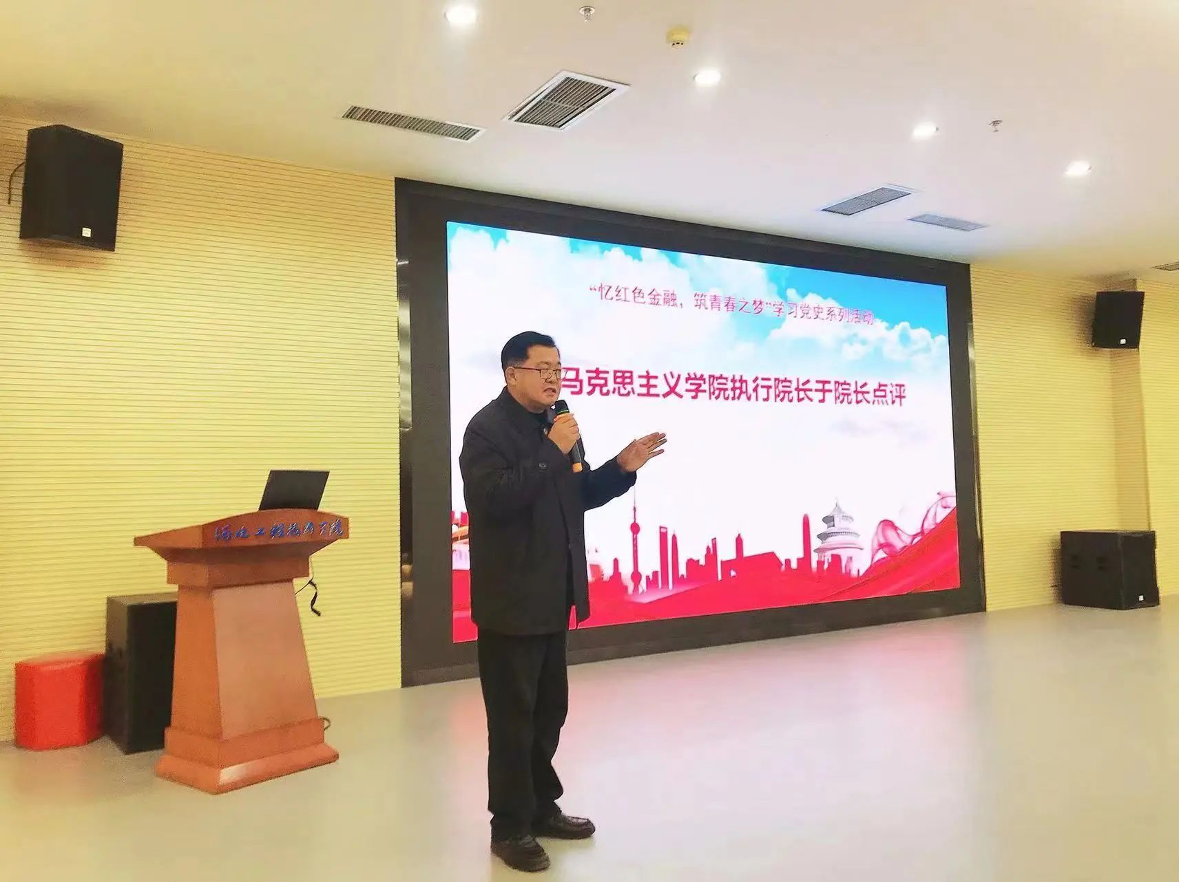 讲座最后,马克思主义学院执行院长于多珠教授进行了精彩的点评:张红柳老师条理清晰、思维严密、由浅入深讲述专业知识,达到了悉心育才效果;吴亚伟老师思政元素挖掘到位,故事生动扣题,达到了课程思政的育人效果;两位老师一个讲现实,一个讲历史,历史与现实贯通,史思交融,珠联璧合;整个讲座效果非常好,这与两位老师反复进行沟通,精选材料,精心设计,多次打磨分不开的;讲座的整个过程学生听讲认真,气氛活跃,彰显了商学院良好的学风,这是多年来商学院领导非常重视大学生思想政治工作,注重大学生思想政治教育的良好体现;整个讲座流程顺畅,各个环节衔接到位,这是商学院在座的领导、老师和商学院思政教研室的老师付出的结果。立德树人是教育的根本任务,课程思政和思政课程同向同行,同心同德,我们所做的一切都是为了学生的成长,成才服务,希望在座的师生把红色基因深植于内心里,利用好大思政讲座这个平台,讲好红色金融故事,弘扬红色金融精神,在新时代下,敢于有梦,勇于追梦,勤于圆梦!